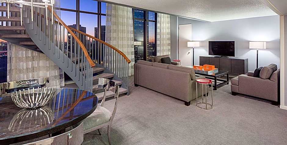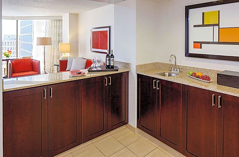 Wider doorways, a raised toilet seat, and a bathroom with grab bars are featured in this wheelchair accessible suite.